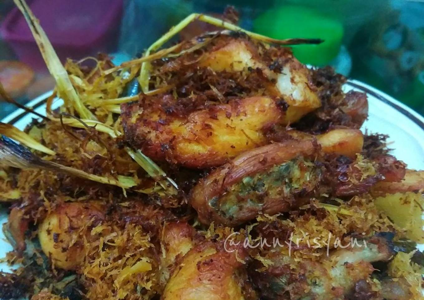 Goreng terpisah antara daging ayam dan kelapa, goreng bergantian. Setelah semua matang. Panggang ya dengan suhu 120°, supaya minyak turun. Selamat mencoba..