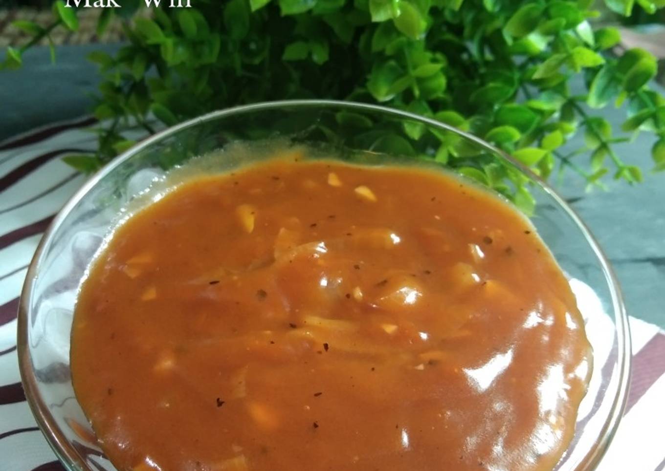 - Panaskan pan,masukan mentega biarkan mencair masukan bawang putih masak sampai harum. Masukan bawang Bombay masak sampai setengah layu tambahkan air masak sampai mendidih.masukan saos tomat, kaldu bubuk, gula,lada,garam kecap manis dan saos tiram aduk rata.tes rasa.terakhir masukan larutan maizena aduk dan masak dengan api sedang sampai meletup".matikan kompor.
