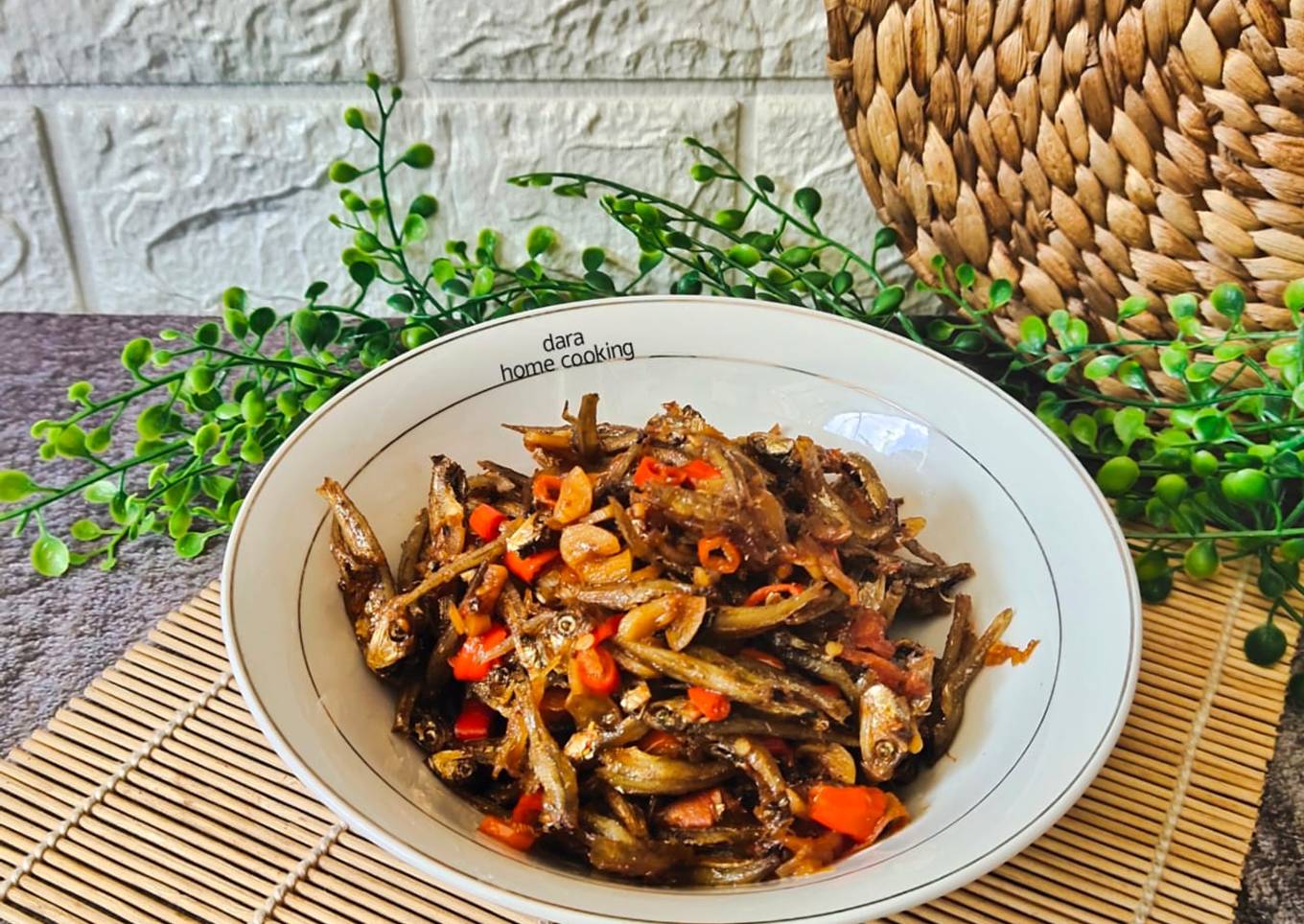 - Masukkan teri goreng setengah matang. Aduk rata hingga mulai kering kuahnya, lalu angkat dan koreksi rasa.