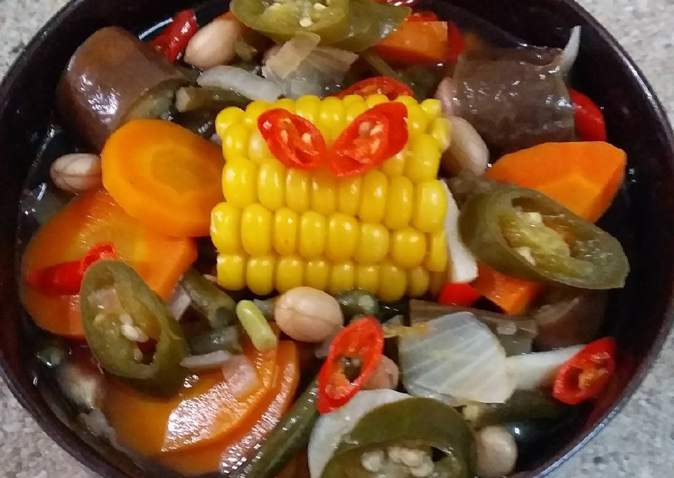 - Jika jagung dan kacang tanah sudah empuk masukkan semua sayuran. Tambahkan garam,gula pasir dan kaldu jamur secukupnya.