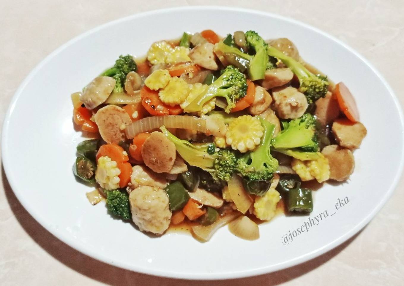 - Masukkan wortel dan jagung baby bersamaan. Kemudian masukkan bakso. Tambahkan garam dan lada hitam bubuk. Aduk rata kurang lebih satu menit.