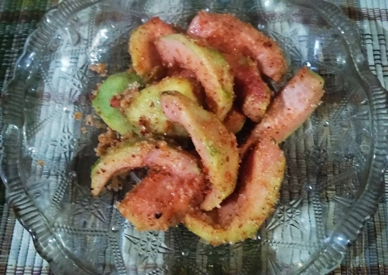 - Masukkan potongan jambu, tutup dan kocok hingga bumbu menutupi semua buah. Lebih nikmat disajikan dingin
