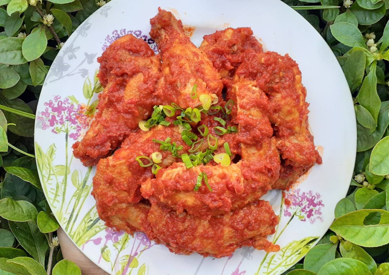 5 menit sebelum kompor dimatikan, masukkan irisan daun bawang & aduk rata. - Ayam bumbu merah siap disajikan