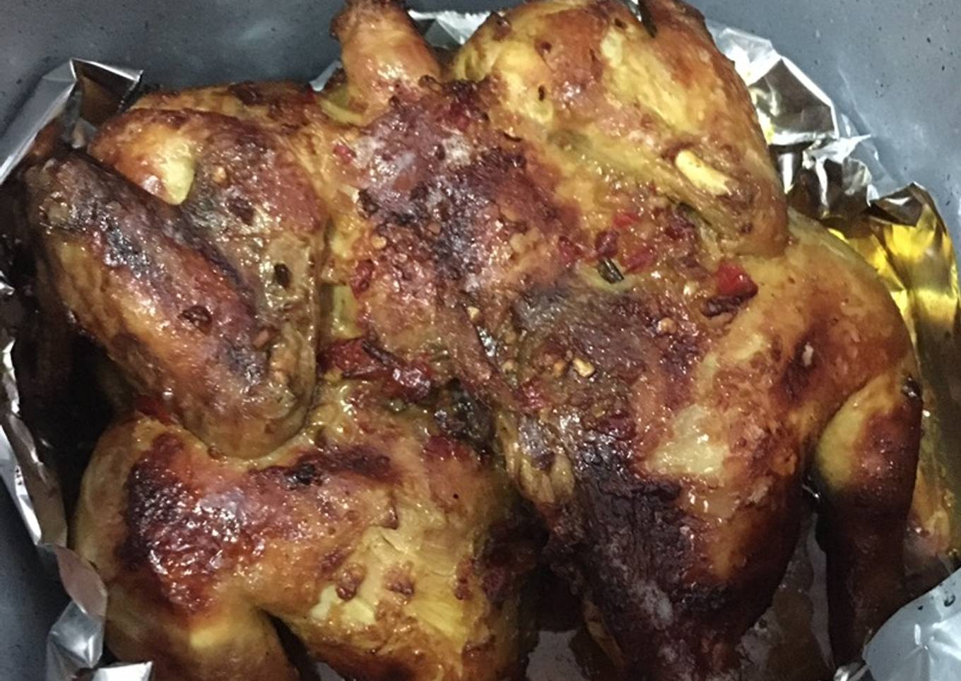 - Pindahkan ayam dalam air fryer yang sudah dialasi alumunium foil. Masak dengan mode 'chicken' yaitu selama 25 menit dengan suhu 180 derajat celcius.